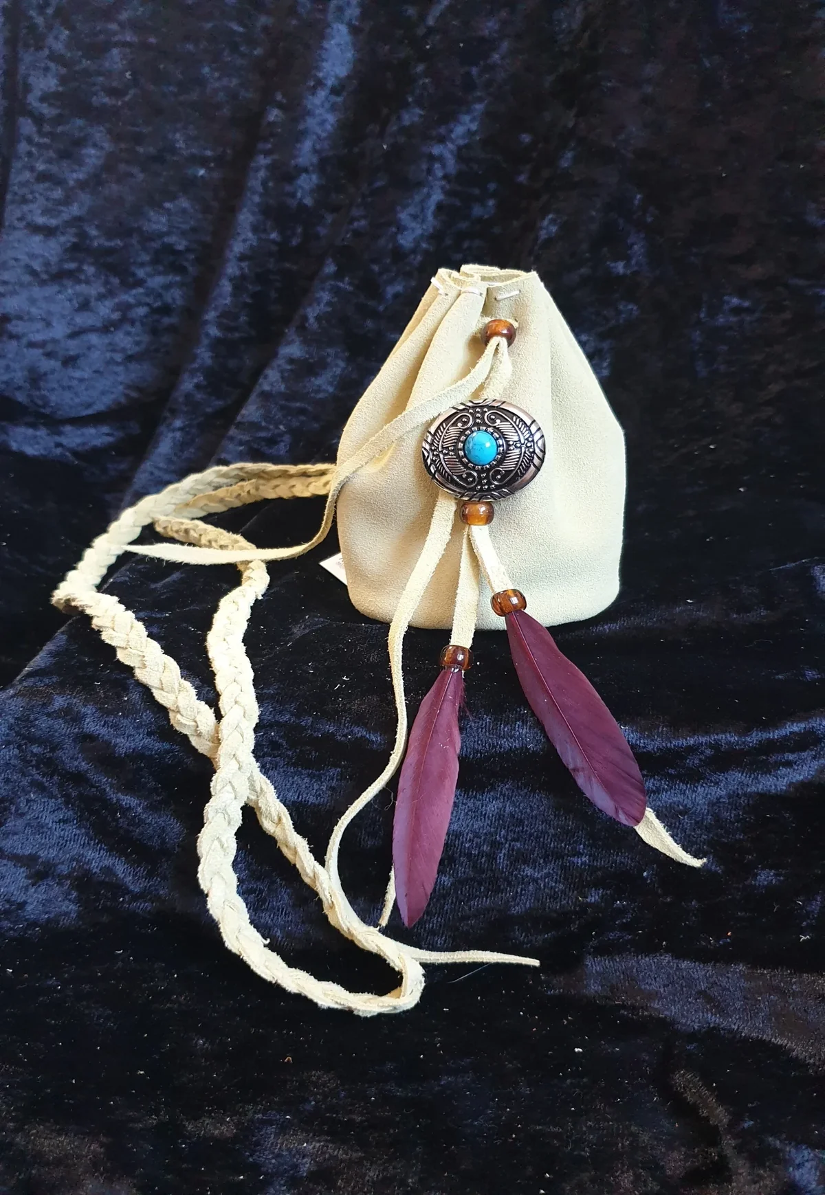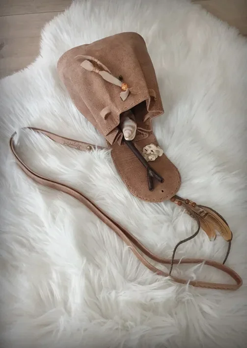A medicine bag is a small, sacred pouch filled with items like herbs, crystals, and feathers, each holding spiritual or healing significance. It is carried for protection, guidance, or healing, and is unique to the person it’s made for.